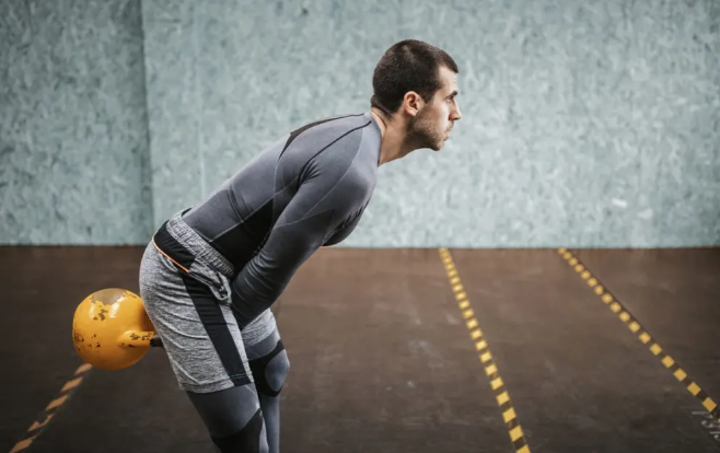 - Place a kettlebell on the floor about a foot in front of you.